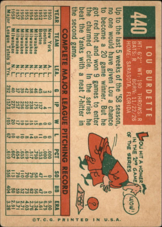 1959 Topps #440 Lou Burdette Posing as if lefthanded - NM