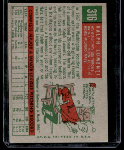 1959 Topps #316A Ralph Lumenti UER Option Photo actually Camilo Pascual - NM