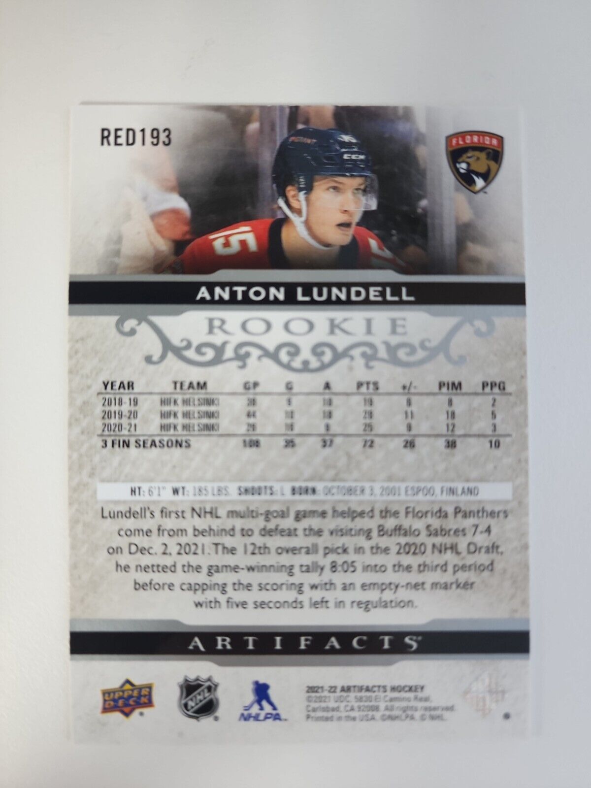 2021-22 UD Artifacts Anton Lundell #d/999 Rookie RC Panthers!!!.