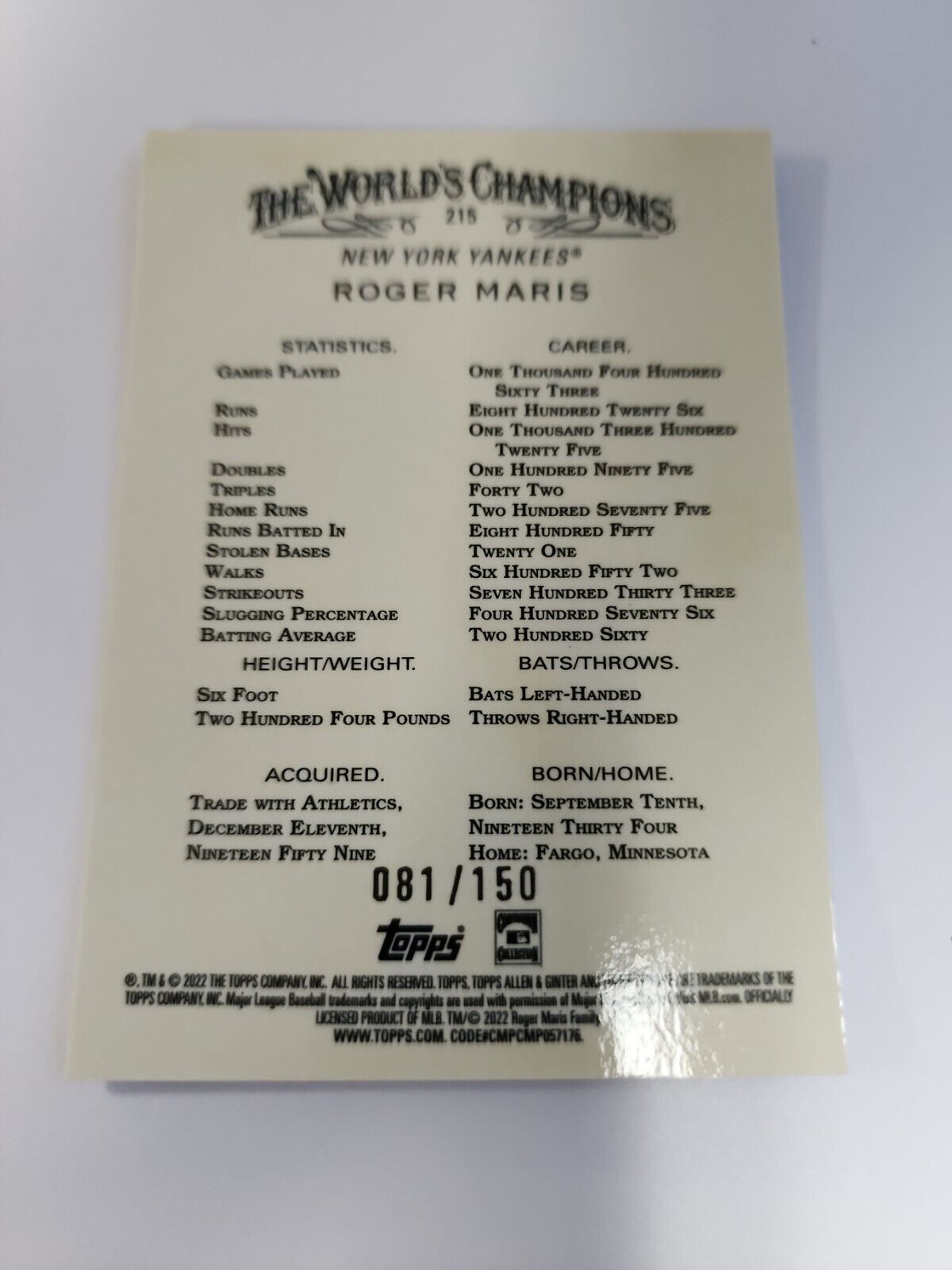 2022 Allen and Ginter Chrome Base Blue #215 Roger Maris /150 - New York Yankees.