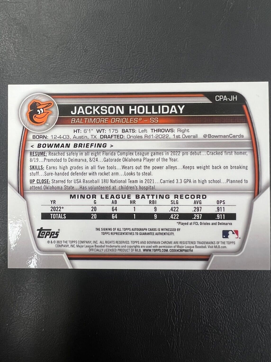 2023 Bowman Chrome BALTIMORE ORIOLES #CPA-JH JACKSON HOLLIDAY -ON CARD AUTO J