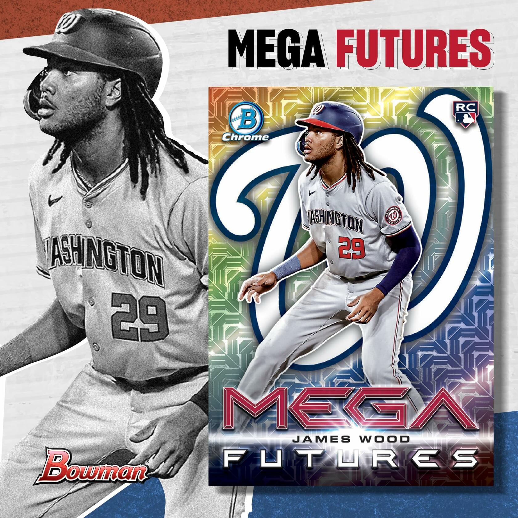 - What’s Included: Each Mega Box contains four 10-card Bowman packs, plus two 5-card exclusive Mega Chrome packs. The four Bowman packs feature cards from the 100-card Base Set and 150-card Bowman Prospect Set. The two exclusive Mega Chrome packs include chrome versions of top veterans, rookies, and prospects on the collector’s favorite Mega Chrome pattern.