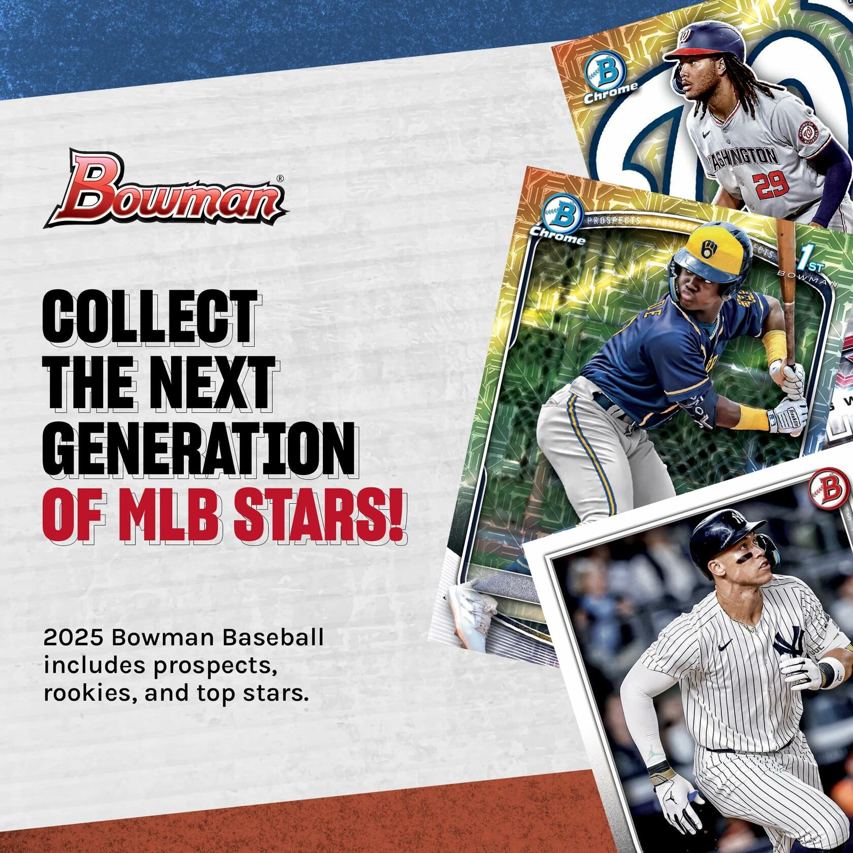 - Two Base Sets to Look For and Collect: With a 100-card Base Set and a 150-card Bowman Prospect Set, this year’s Bowman highlights 1st Bowman cards, rookies, and top stars. This release marks a defining chapter in your 2025 baseball card collection.